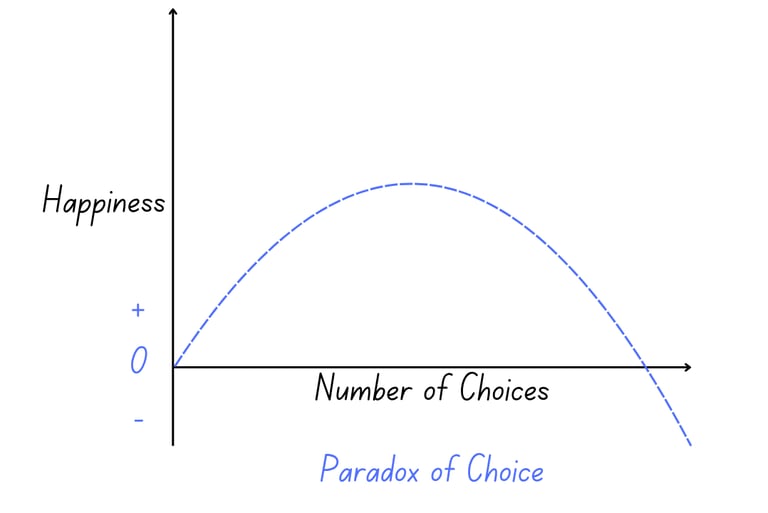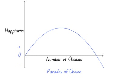 Barry Schwartz introduced the concept ‘Paradox of Choice’, which suggests that after a certain number, the more options we have, the less satisfied we feel with our decision. Having too many choices leads to increased regret over the decision we make.