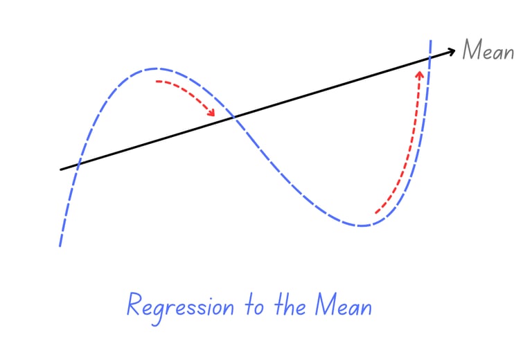 Often times, when something extreme happens and the extremity recedes in subsequent events, we look for a cause, but what really happens is a simple rule of statistics, and that is regression to the mean. In markets, when assets become overvalued due to whatever reasons, regression to the mean works its magic to pull the prices down and vice versa. In cases like this, we often look for causal explanations because our mind is strongly biased towards them and does not deal well with mere statistics. Regression to the mean holds true because the variables that lead to extreme events or outlier results (e.g. luck, irrational exuberance, unjustified pessimism, economic cycles) are fickle.